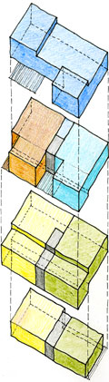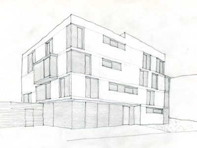 | Zentrales gestalterisches Thema dieses Wohngebäudes ist die Spannung zwischen System und Individuum , die Grundbedingung des Bauens für Baugemeinschaften ist. Das Haus wirkt als Einheit, bringt aber gleichzeitig die Individualität seiner mehreren Bauherrschaften zum Ausdruck. |