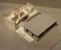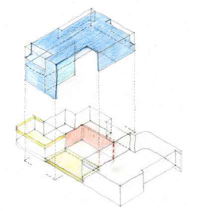 Das Roncallihaus ist daher trotz der neuen vertikalen Raumbezüge in drei klar unterschiedene Ebenen gegliedert: Das Erdgeschoss für die Gemeinde (Saal, Tagungsräume, Küche), das Untergeschoss für die Jugend, das neue Obergeschoss für die Büros des Pfarrers, der Sekretärin und der pastoralen Mitarbeiterinnen. |