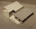 | Bestehende und neue Bauteile sind konstruktiv und gestalterisch klar voneinander unterschieden: im bestehenden Gebäude bleibt Sichtbeton das bestimmende Material, der Neubau ist aus Holz konstruiert und umhüllt von einer gedämmten und hinterlüfteten Fassade aus Lärchenholz-Latten. Im Gegensatz zur kleinteiligen, skulpturalen Form des Bestandes hat die Aufstockung ein einfaches und ruhig gegliedertes Erscheinungsbild. |