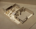 Mit der Aufstockung des mittleren Bereiches kann die Eigenständigkeit des Gemeindehauses gewahrt und die zentrale Verteilerfunktion des Foyers gestärkt werden. Durch einen Einschnitt ins Dach entsteht ein zweigeschossiger, großzügiger und lichtdurchfluteter Hallenraum, um den alle Gemeinderäume und auf der Galerie das Pfarrbüro angeordnet sind. |