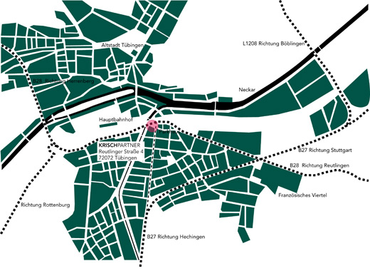 Von der B27 aus Richtung Stuttgart/Filder an der dritten Tübinger Ausfahrt benutzen, sondern auf der B27 auf die B28 Richtung Herrenberg wechseln. Etwa 1 km auf der B28 bleiben. Gleich nach der Blauen Brücke, die nach rechts Richtung Innenstadt führt, links abbiegen - ausgeschildert ist hier das Parkhaus Metropol. Unmittelbar nach dem Abbiegen wieder nach rechts in die kurze Stichstraße einbiegen. Reutlinger Straße 4 ist das graue Haus gegenüber den Parkplätzen. |