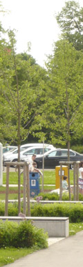 | Eine markante, mit städtischen Funktionen wie Bushaltestelle, Stadt-Information etc. belegte Grünschiene bindet die altstädtische Fußgängerzone nach Westen in Richtung Stadthalle und Donau an und inszeniert die Wahrnehmung der Stadtsilhouette mit Schloss und Stadtpfarrkirche. |