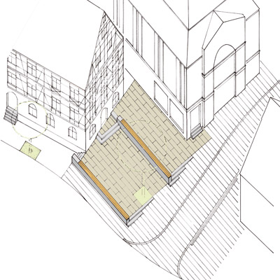 Durch Reduzierung und Neuordnung der Verkehrsflächen entstehen großzügige Freibereiche, die vom Gasthof Bären und den Cafés Hoftheater und Schöneck genutzt werden. Die räumliche Qualität des Stadteingangs wird mit einfachen gestalterischen Mitteln sichtbar und erlebbar gemacht. |